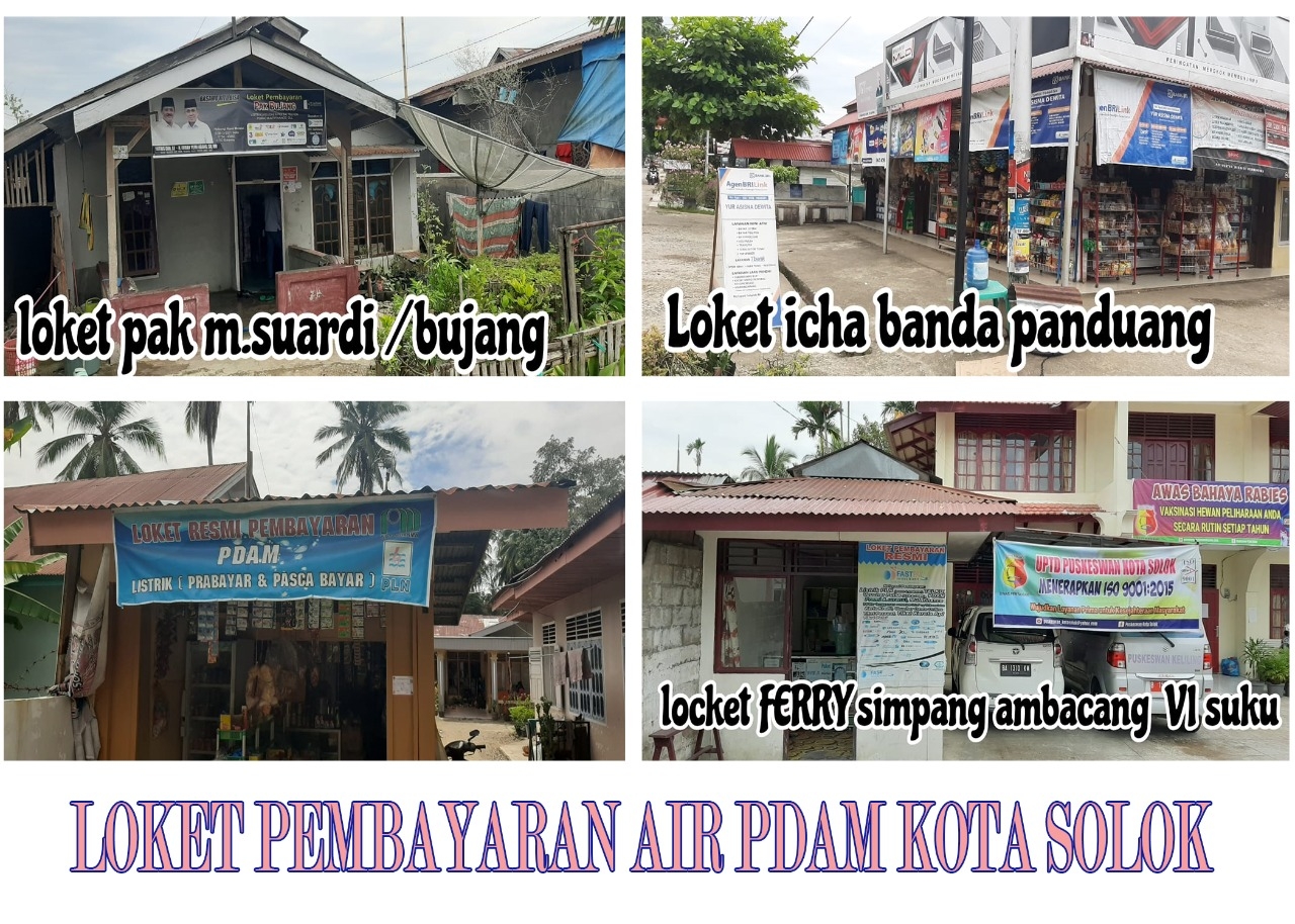 INFO PELANGGAN PDAM KOTA SOLOK, KAMI BERUSAHA MEMBERIKAN KEMUDAHAN PEMBAYARAN REKENING AIR UNTUK SAAT SEKARANG INI SELAIN DI KASIR PDAM. PELANGGAN DAPAT MEMILIH TEMPAT PEMBAYARAN YANG TERDEKAT DARI RUMAH. ANTARA LAIN : 1. KOPERASI a. Kopegtel Solok (Telkom Solo